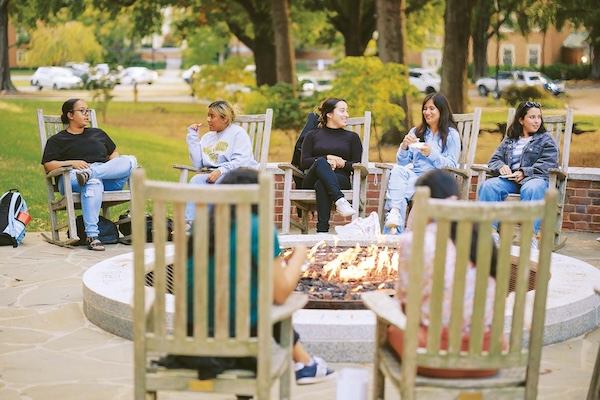 Ky Ordanza (’28) says that she, Morgan Rice (’28) and their friends are “always connecting here in the middle” between campus activities to sit and talk for a while. “I love seeing people outside, everyone collecting, everyone saying hi,” Ordanza says. “It’s just really nice. It makes me feel so warm inside.”