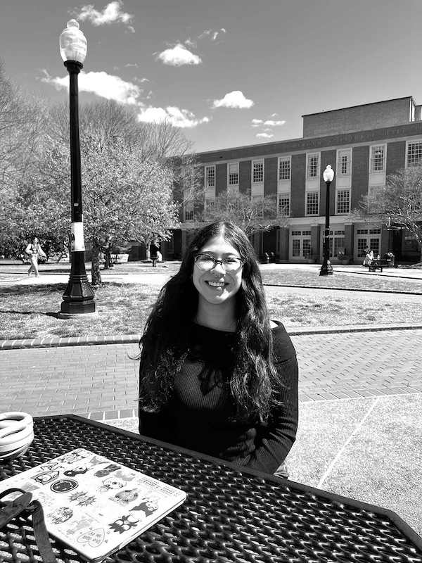 Britney Aguilar (’25), a psychology major, says that, because of her ADHD, being outside is “really good for me. … it really helps me focus and keep my attention and get my work done. … There’s just more to see, I guess. The trees, like the sun, the clouds, everything. I’m not paying attention as much to the other students or trying to compare myself to other students. It’s more about me and what I’m doing and my place in the campus.”