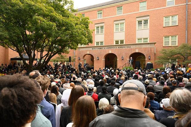 On Saturday, the Mozons were among hundreds of people at the official dedication of Beth Norbrey and Lawrence D. Hopkins Hall. South Hall officially has been renamed for Beth Norbrey Hopkins (’73, P ’12) and her husband, the late Dr. Larry Hopkins (’72, MD ’77, P ’12), who were both Wake Forest professors and trailblazing students who became devoted alumni and trustees.