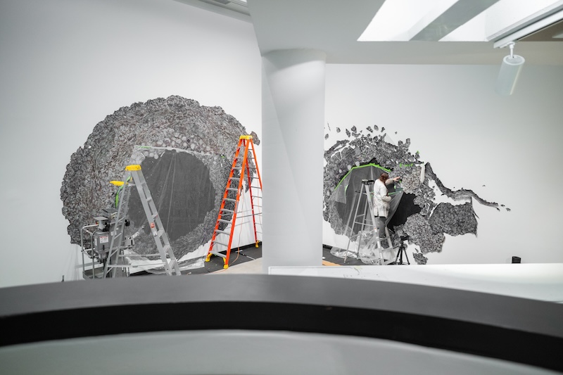 Assistant Professor Molly Kaderka prepares a painting created with several students in Scales Fine Arts Center.