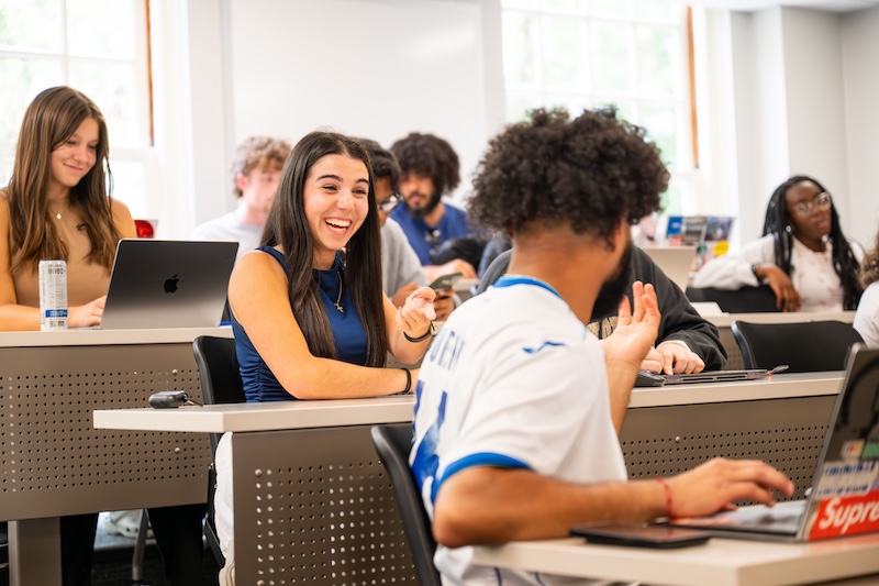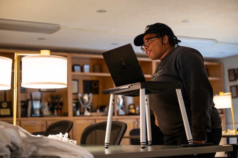 At Green’s cue, the debaters break into small groups and quickly scatter throughout the building to keep cramming; in two days, they will hit the road. In one room, Dimarvin Puerto (’24, MA ’26), a graduate assistant coach, marks up a whiteboard while his group outlines arguments. In another, students circle up to talk through strategy. Back in Carswell 101, more debaters are heads down, typing vigorously into their laptops, most of which sport “Think Hard, Talk Fast. Yikes!” stickers. At the podium, a student runs through a speech, speaking with fervor as he packs as many words as possible into a few minutes.