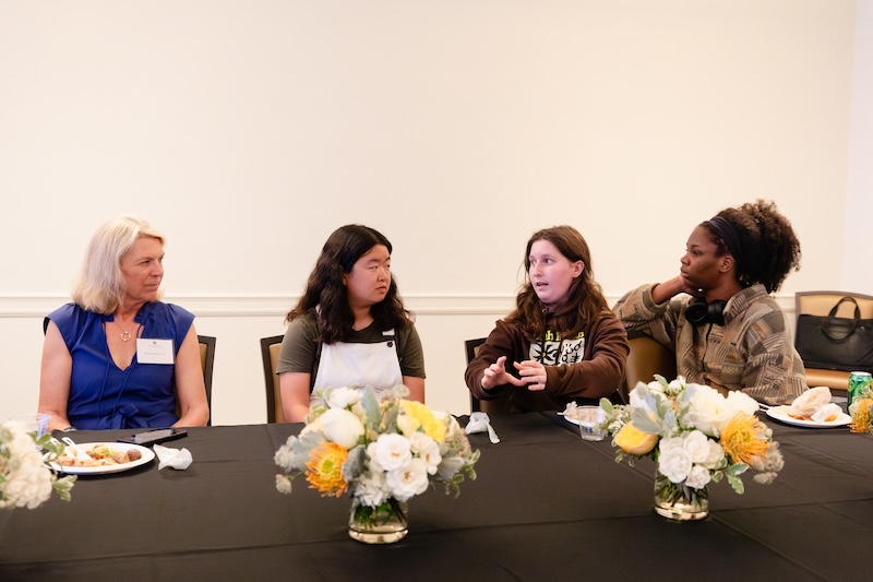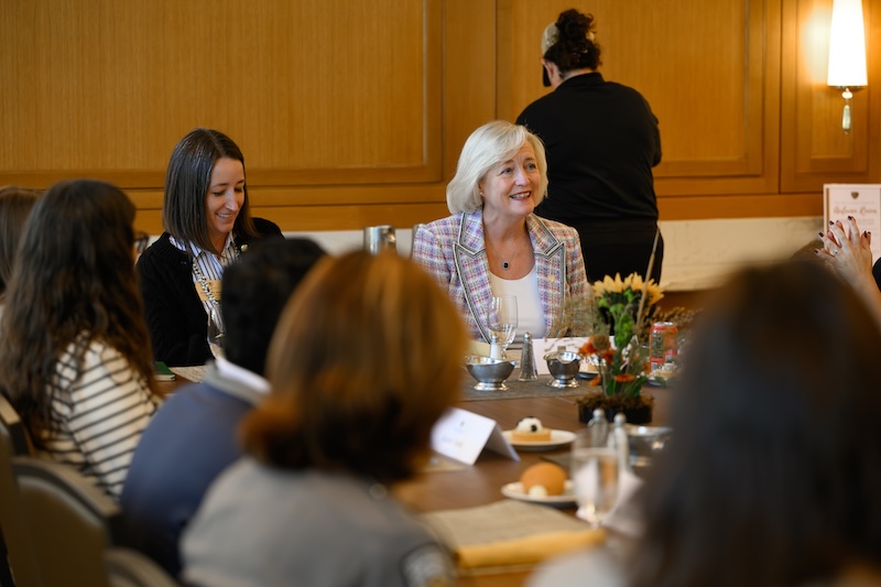 Students who studied last summer in sub-Saharan Africa through the Rusty Johnson Study Abroad program share what they learned with René Johnson (P ’26) at dinner in Reynolda Hall’s Autumn Room. She established the program in 2023 in memory of her late husband.