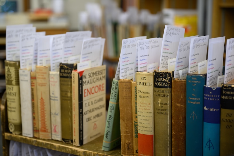 Stepping into the library’s Preservation Room feels like walking back into an analog world. Except for one desktop computer, the room is lined with stacks of books, letterpress prints, framed photos and vinyl records, wooden and paper boxes and jars of paste. Worktables and machinery, including a giant paper cutter, dominate the room.