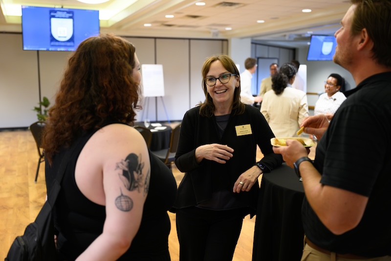 Kimberley McAllister, middle, the University’s Vice Provost for Research, Scholarly Inquiry and Creative Activity, chats with faculty at the research celebration.