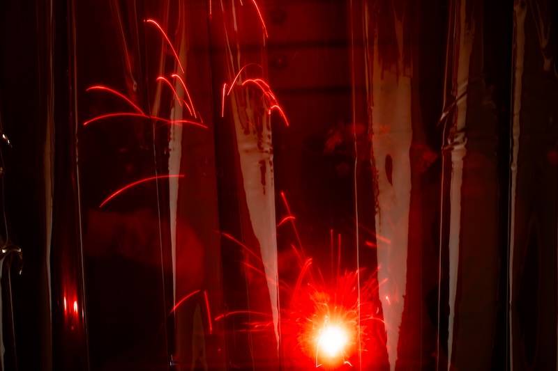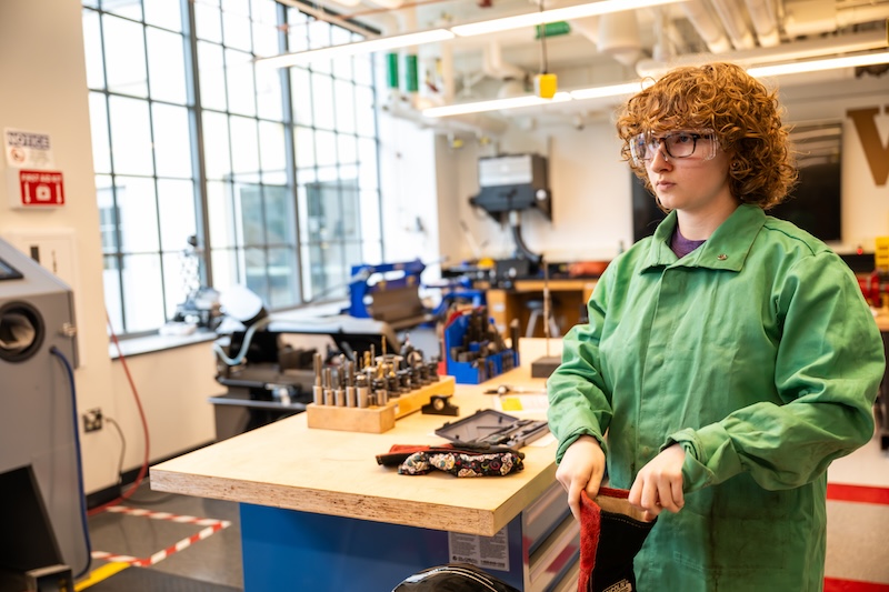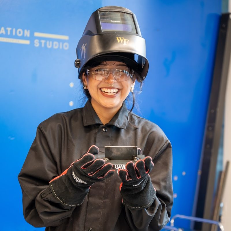 Rocio Saucedo, a junior majoring in studio art and politics and international affairs, holds up a freshly welded creation in the engineering department’s Innovation Studio at Wake Downtown. Alongside other students and a faculty member at Welding Wednesdays, she has suited up in a flame-resistant jacket, gloves and helmet. Sparks fly in the welding booth as they work on their creations. Several students are taking an art class creating linear sculptures — and now they can weld their works together. As the students push a puddle of molten metal along, they’re uniting the disciplines of engineering and art, which have more similarities than some may think: a good weld means the finished product is strong and beautiful.
